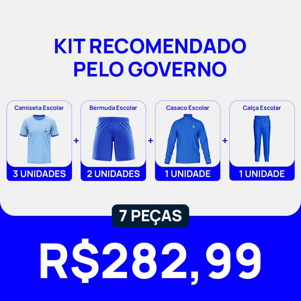 O Kit de uniforme vendido é um padrão feito pela prefeitura. O padrão contém: 3 Camisetas, 2 Bermudas, 1 Casaco e 1 Calça. Sendo assim, não é permita a venda de peças avulsas ou edições em quantidade.
